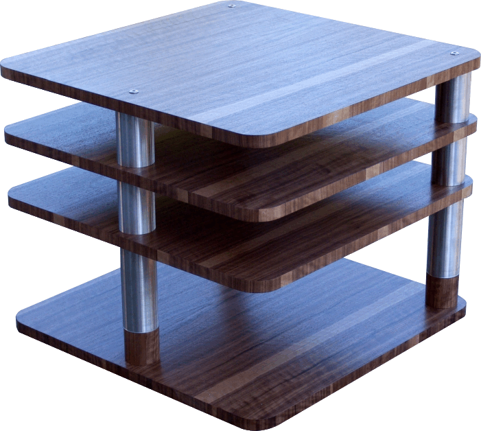 Ezen készülékállványunk az üvegpolcos állvány egyszerűsített változata, melynél az üveglapokat furnérozott MDF lapokkal helyettesítjük. A lapok furnérja tetszőlegesen megválasztható, akár hangsugárzóinkkal vagy meglévő bútorainkkal azonos színűre készítve azokat, jobban illeszkedve így az adott környezetbe. Az egyszerűsítés az készülékállvány lábkialakításánál jelentkezik, elhagyva arról a kúpokat és az acélgolyókat. A kevesebb alkatrész egyszerűbb szerelést és kedvezőbb szintenkénti árat jelent. Megmaradt viszont a rozsdamentes acél csőláb, melyeket menetes szárak húznak fixen össze és megmaradt a rugalmasság a téren, hogy a szintek számát és azok magasságát saját magunk a meglévő készülékállományunkhoz igazítva szabjuk meg. A szintén elől kettő és hátul középen egy lábkialakításnak köszönhetően ez is egy nagyon stabil és a vastag MDF szinteknek köszönhetően nehéz, jó rezgéscsillapítású készülékállvány.